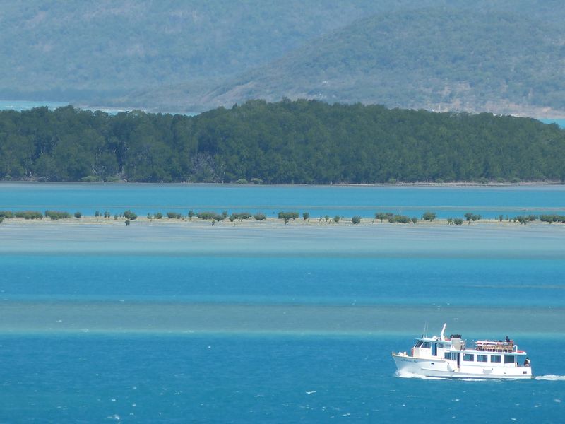 Dort, wo auf der Karte ein Regenwald eingezeichnet ist, entdecken wir ein kleines Gehölz, etwa 100 Meter lang. Hier kommt uns auch schon wieder der Reisebus entgegen, die erledigen das offenbar alles etwas flotter. Der Weg zu Fuß über die Insel führt uns durch Wohnsiedlungen, an einer Boatramp vorbei (wo ein Hinweisschild steht, dass Dugong-und Schildkrötenschlachten an dieser Stelle nicht gestattet ist...!), durch Industriegebiete und über einen Track mit schöner Aussicht (Lions Lookoout) auf die Torres Strait.